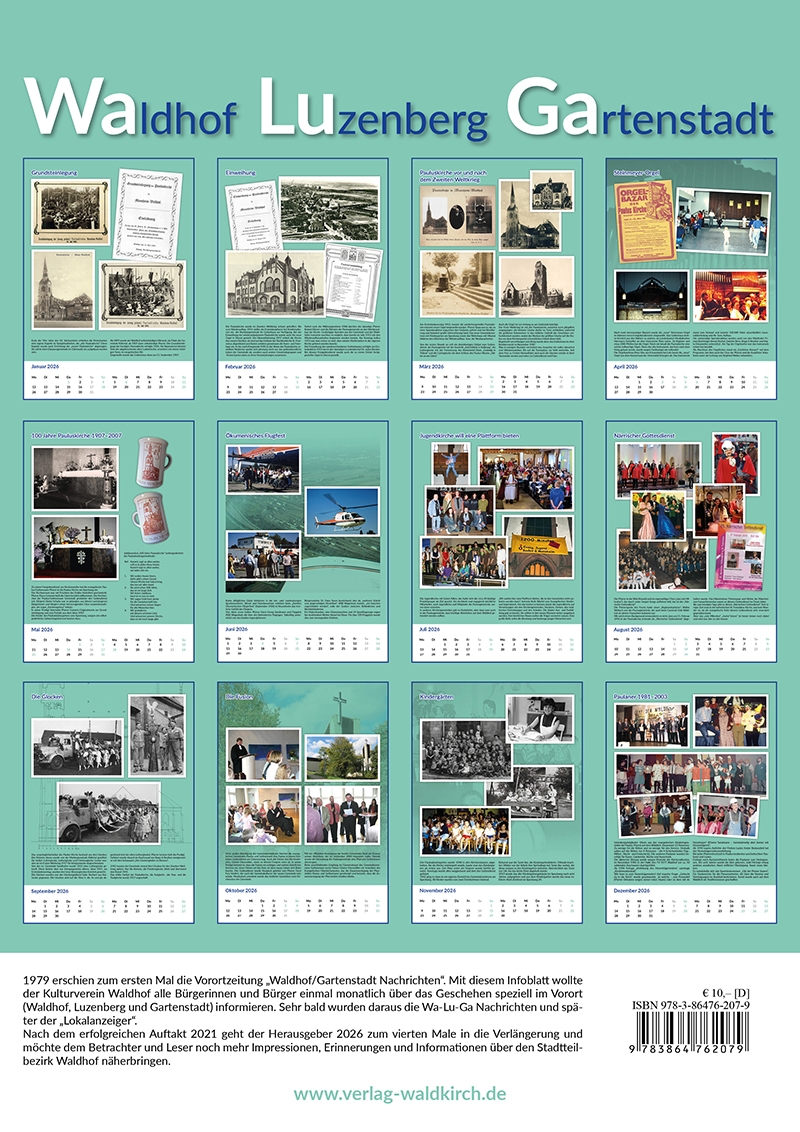 1979 erschien zum ersten Mal die Vorortzeitung „Waldhof/Gartenstadt Nachrichten“. Mit diesem Infoblatt wollte der Kulturverein Waldhof alle Bürgerinnen und Bürger einmal monatlich über das Geschehen speziell im Vorort (Waldhof, Luzenberg und Gartenstadt) informieren. Sehr bald wurden daraus die Wa-Lu-Ga Nachrichten und später der „Lokalanzeiger“. DIN A4 Hochformat, ISBN: 978-3-86476-207-9 Jahr: 2025 Preis: 10 Euro |