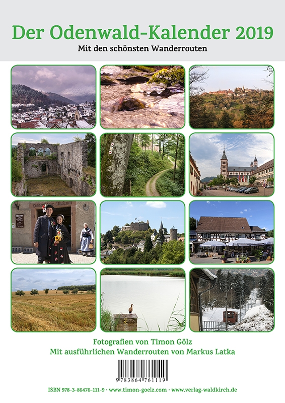 Der neue Odenwaldkalender 2019 Landschaften – Menschen – Kultur Der Odenwald, der sich über drei Bundesländer erstreckt, hat seinen ganz eigenen Reiz. Wälder und Wiesen, Täler und Hochebenen, uralte Kulturlandschaften, malerische Dörfer und Städte und ultramodern arbeitende „Hidden Champions“, Unternehmen von weltweiter Bedeutung, findet man einträchtig nebeneinander. Drei „Odenwald-begeisterte“ Menschen haben sich zusammengetan, um die Schönheiten und Besonderheiten in Wort und Bild herauszuarbeiten, und im wahrsten Sinne des Wortes begehbar zu machen. Ein Special stellt jährlich eine Gemeinde/Stadt in den Mittelpunkt und mehrere ausführlich beschriebene Wanderungen zwischen 13 und 23 km Länge, die alle mit öffentlichen Verkehrsmitteln gut zu erreichen sind, führen zu landschaftlichen Besonderheiten oder naturkundlichen Zielen, und im letzten Quartal zu einem malerischen Weihnachtsmarkt. Der Odenwald ist noch für viele Überraschungen gut, man muss sie nur entdecken. Fakten zum Kalender: 14 Blatt Din A4 mit Spiralbindung, Deckfolien vorn und hinten, auf den Vorderseiten großformatige Fotografien von Timon Gölz, auf den Rückseiten ausführlich beschriebene Wanderungen des zertifizierten Wanderführers Markus Latka mit Wanderkarten, Fotos und Hinweisen zu landschaftlichen, städtebaulichen, naturkundlichen und kulturellen Besonderheiten.