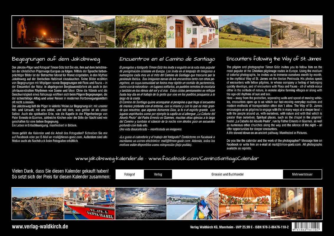 Begegnungen auf dem Jakobsweg Der Jakobs-Pilger und Fotograf Timon Gölz lädt Sie ein, ihm auf dem beliebtesten der christlichen Pilgerwege Europas zu folgen. Mittels der Sprache farbenprächtiger Bilder ist der Betrachter Monat für Monat eingeladen, in den Mythos Jakobsweg auf der Iberischen Halbinsel einzutauchen. Seine Bilder erzählen von Begegnungen mit Mitpilgern sowie Begegnungen mit Flora und Fauna – in der Einsamkeit der Natur, in abgelegenen Bergbauerndörfern als auch in den jahrtausendealten Rhythmen von Sonne und Meer. Ohne die Wände und die Geschwindigkeit eines Fahrzeugs eröffnen sich beim Pilgern Begegnungen, die der schnelllebige Alltag und unser Reisen in modernen Fortbewegungsmitteln oft nicht zulassen. Der Jakobsweg lädt die Pilger in vielerlei Weise zur Begegnung ein: mit unserer Mit- und Umwelt, mit uns selbst, und mit dem, was größer ist als unser Selbst. Auch die spirituellen Orte, wie die Kapelle in der Pilgerherberge von Pater Ernesto in Güemes, zahlreiche Kirchen oder die Stille der Nacht sind wie geschaffen für eine tiefere Begegnung. Ein Leben in Entschleunigung, manifestiert in Bildern.