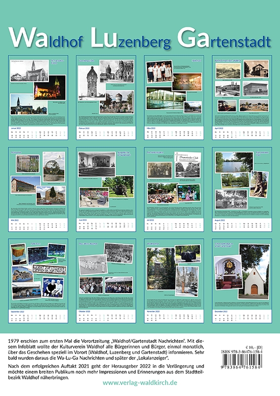 1979 erschien zum ersten Mal die Vorortzeitung „Waldhof/Gartenstadt Nachrichten“. Mit diesem Infoblatt wollte der Kulturverein Waldhof alle Bürgerinnen und Bürger, einmal monatlich, über das Geschehen speziell im Vorort (Waldhof, Luzenberg und Gartenstadt) informieren. Sehr bald wurden daraus die Wa-Lu-Ga Nachrichten und später der „Lokalanzeiger“. DIN A4 Hochformat, ISBN: 978-3-86476-158-4 Jahr: 2021 Preis: 10 Euro |